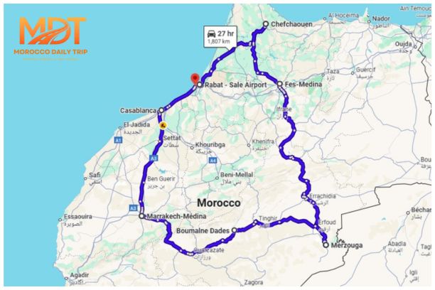 Discover Morocco in depth on a 10 Days Tour from Rabat, thoughtfully designed for travelers who want time, balance, and authentic discovery. This immersive journey takes you from the capital Rabat to the blue streets of Chefchaouen, the cultural richness of Fes, the golden dunes of the Merzouga Desert, and the vibrant energy of Marrakech, before continuing to Casablanca and returning to Rabat.