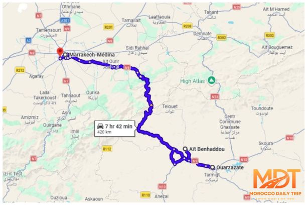 Full Day Trip:Marrakech » High Atlas Mountains » Ait Ben Haddou » Ouarzazate and back to Marrakech (≈ 420 km total drive)