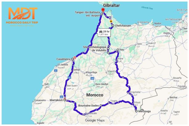 After breakfast, depart Chefchaouen and begin the final drive back to Tangier. The route passes through northern landscapes and rolling hills, offering a final glimpse of Morocco’s natural beauty. Depending on your flight schedule, you may have time for short stops along the way before arriving at Tangier Airport. Upon arrival, your driver will assist with luggage and ensure a smooth departure process. This marks the end of your Morocco itinerary 10 Days, having experienced imperial cities, mountain ranges, desert landscapes, and coastal charm.