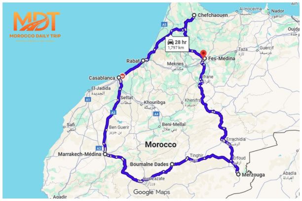 This 6 Day Morocco tour from Fes takes you on a well-rounded journey across Morocco’s most fascinating regions, combining vibrant cities, scenic landscapes, and authentic cultural encounters. The itinerary begins in the north with the relaxed blue streets of Chefchaouen, then continues through Rabat’s historic charm and Casablanca’s modern coastal atmosphere.